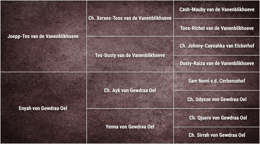° 25 June 2009Vader - Sire: Joepp-Tes van de VanenblikhoeveMoeder - Dam: Enyah von Gewdraa Oel